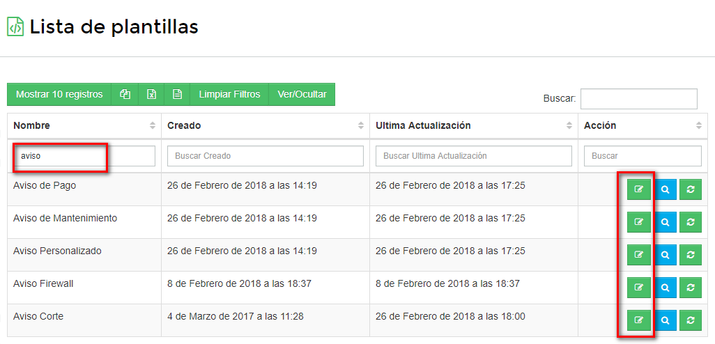1Ingresar a Sistema / Plantillas, buscamos la plantilla ya sea aviso de corte, aviso de pago o mantenimiento y dar click en editar